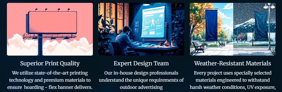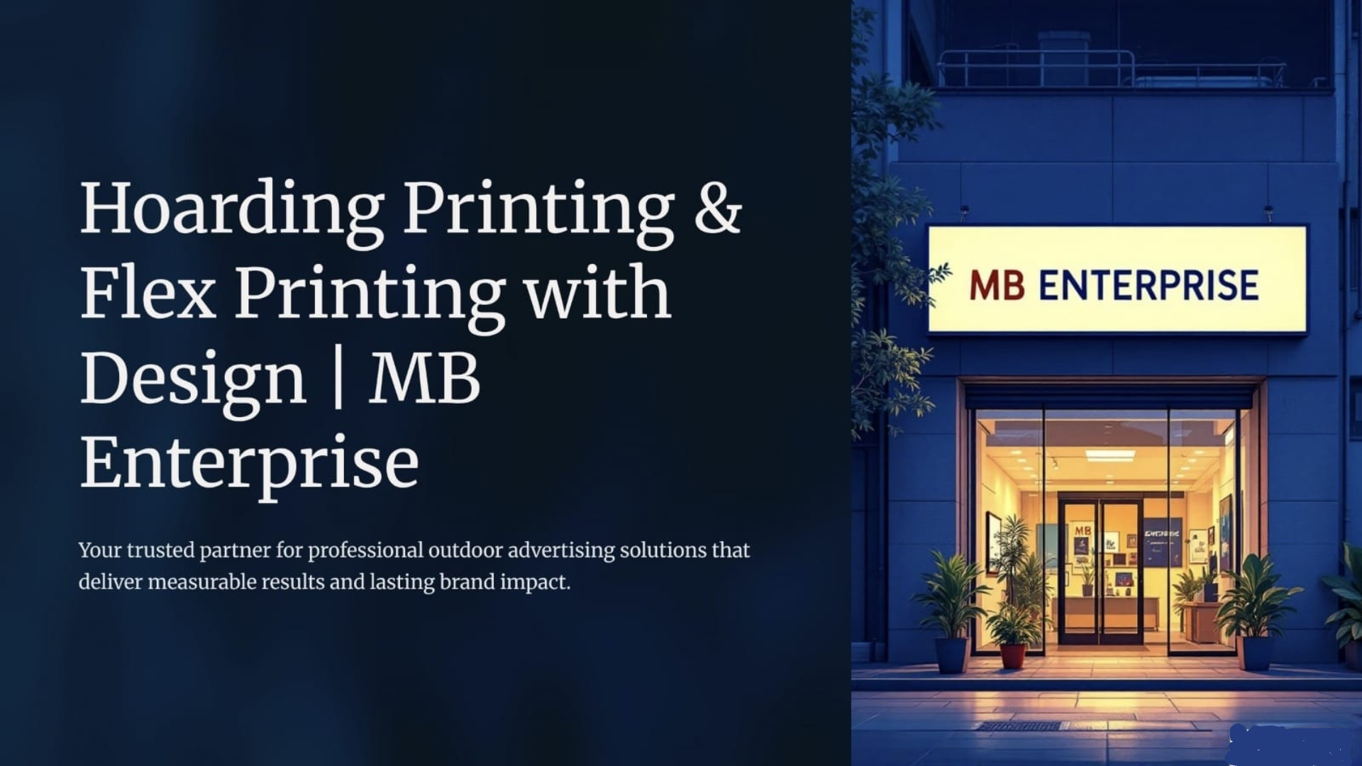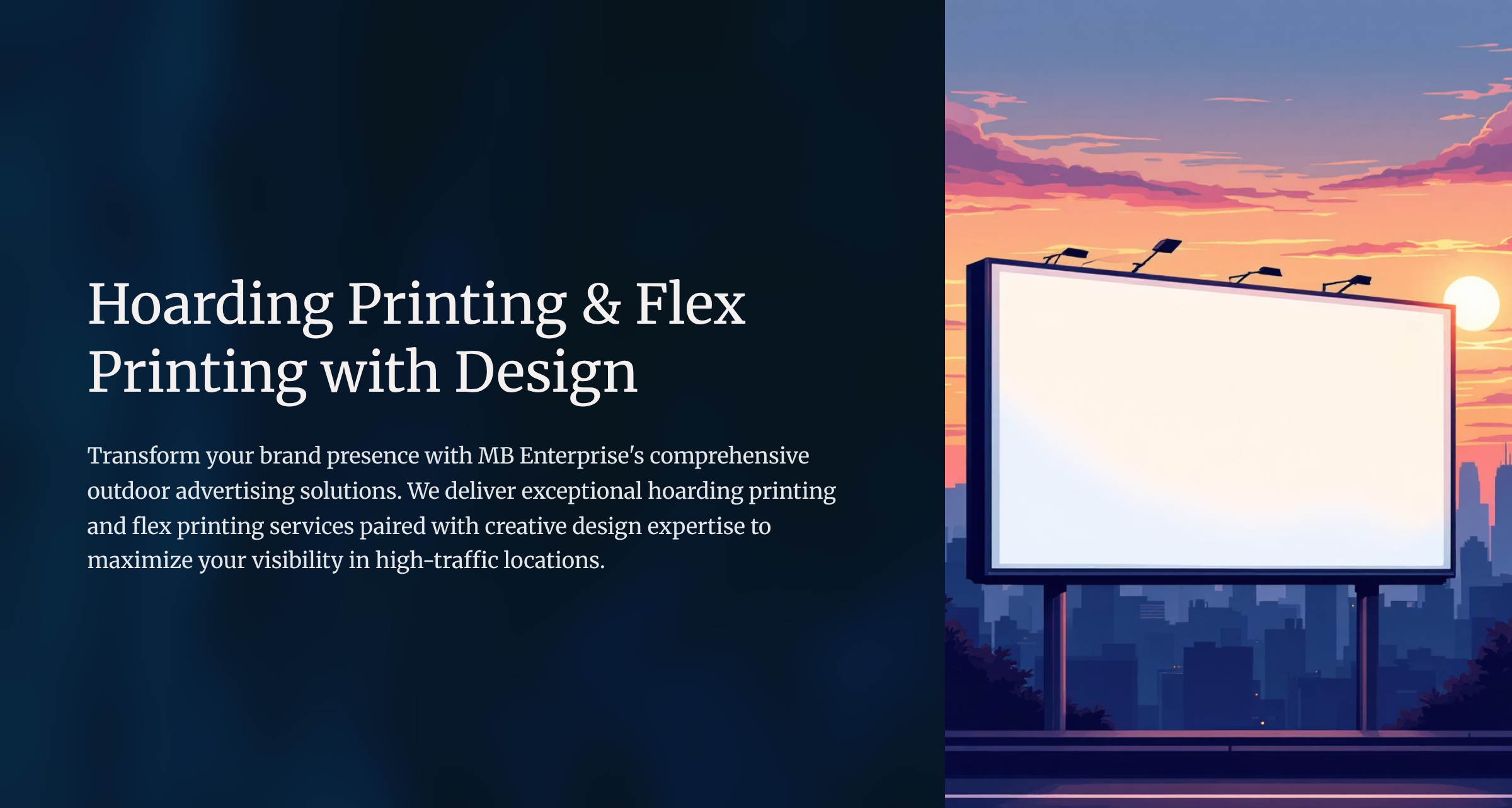 MB Enterprise offers professional Hoarding Printing & Flex Printing with Design services to help brands achieve strong outdoor visibility and impactful communication. Our high-quality printing solutions combined with creative design ensure your message stands out in high-traffic locations and delivers maximum brand recall.